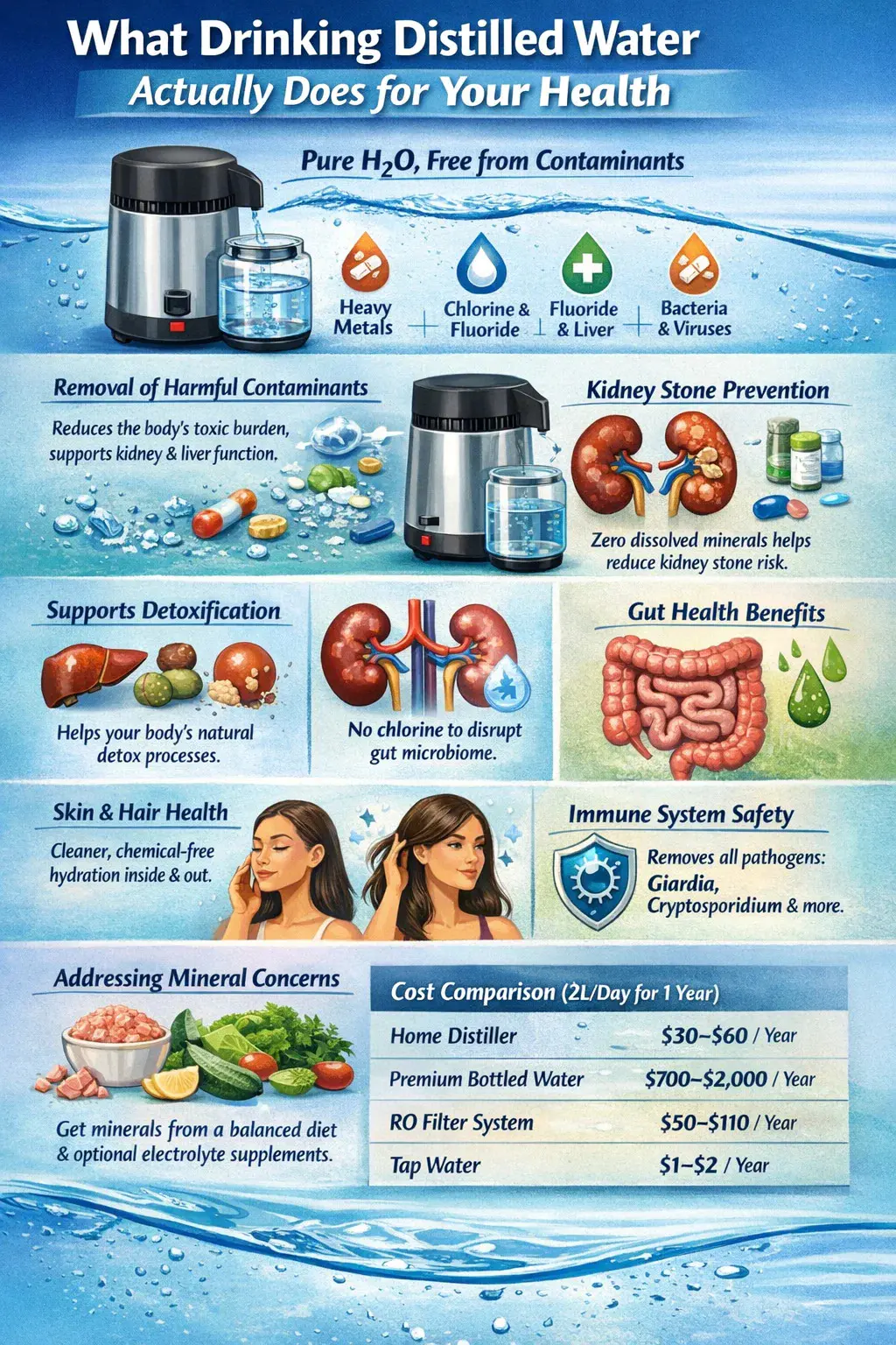Os benefícios para a saúde de beber água destilada são reais, mas são principalmente benefícios da ausência – ausência de contaminantes, patógenos, minerais indesejados e aditivos químicos. Isto não é uma coisa menor. Dado que a pessoa média consome cerca de 700–1.000 litros de água por ano , a diferença cumulativa entre água consistentemente limpa e água contaminada ao longo da vida é significativa.