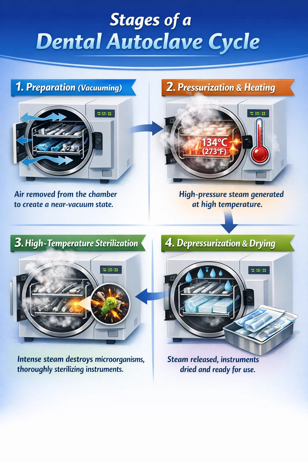 As autoclaves dentárias, em termos simples, funcionam como uma versão atualizada de uma panela de pressão doméstica. Eles utilizam uma combinação de alta temperatura, alta pressão e vapor para eliminar completamente contaminantes microscópicos em instrumentos cirúrgicos.