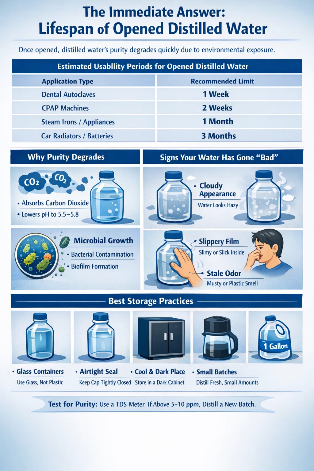 Depois que uma garrafa de água destilada é aberta, seu status de alta pureza começa a se degradar devido à exposição ao meio ambiente. Para fins médicos ou odontológicos – como uso em autoclave – a água destilada aberta geralmente dura 7 a 14 dias se armazenado corretamente em local fresco e escuro. Para eletrodomésticos como ferros a vapor ou umidificadores, pode permanecer utilizável para até 30 dias . Embora a água não “estrague” da mesma forma que os alimentos, ela absorve agressivamente o dióxido de carbono e as partículas transportadas pelo ar, o que pode alterar o seu nível de pH e introduzir contaminantes microscópicos que anulam os benefícios do uso de um destilador de água .