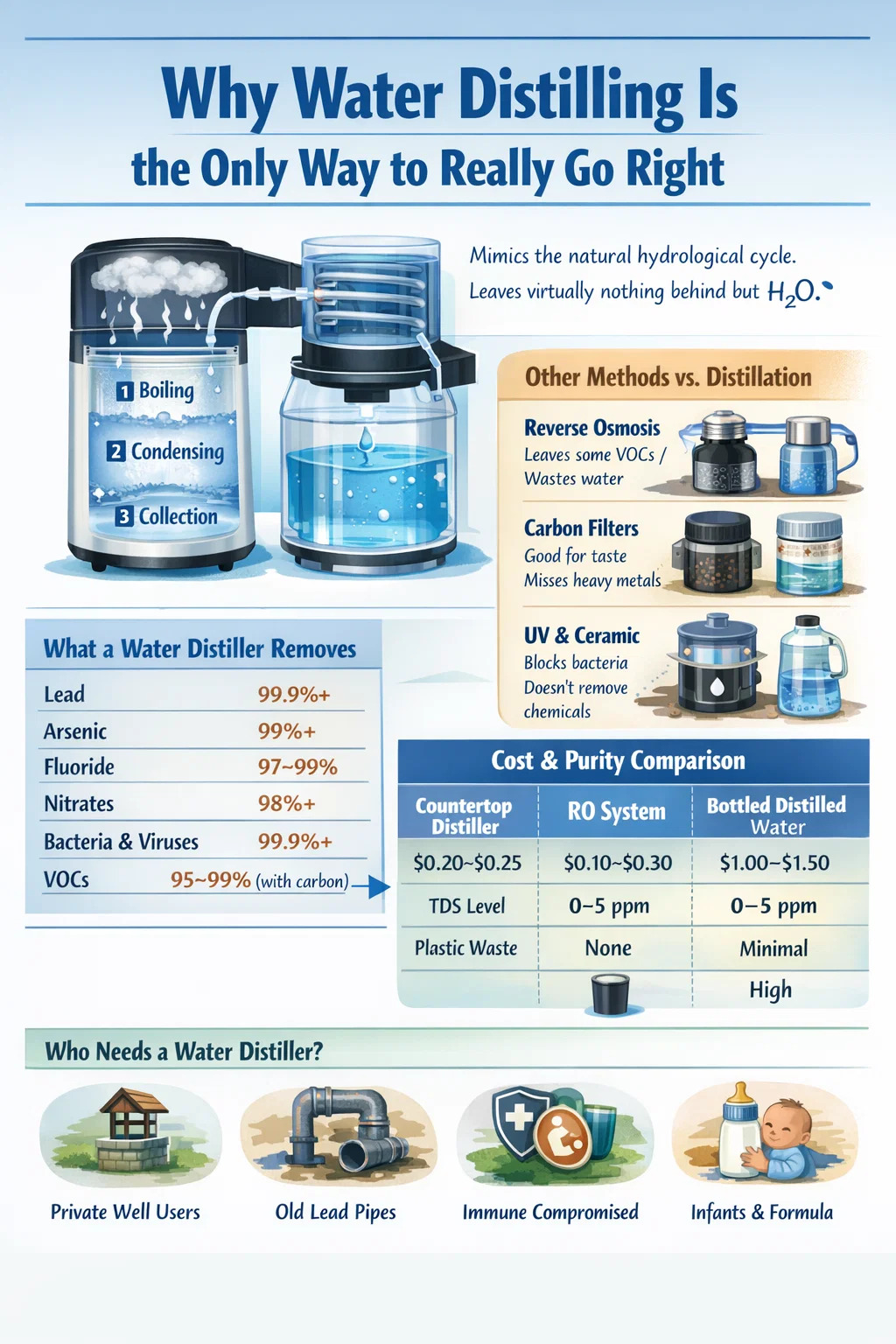 Outros métodos de filtração são seletivos. Eles têm como alvo certos contaminantes, mas deixam outros passarem. Um filtro de carbono remove perfeitamente o sabor do cloro, mas não faz quase nada com chumbo ou nitratos dissolvidos. A osmose reversa remove uma ampla gama de contaminantes, mas luta com certos compostos orgânicos voláteis que evaporam junto com o vapor de água durante a pressão da membrana. Um destilador de água não discrimina. O processo em si é o mecanismo, e a física não abre exceções com base no tipo de contaminante.