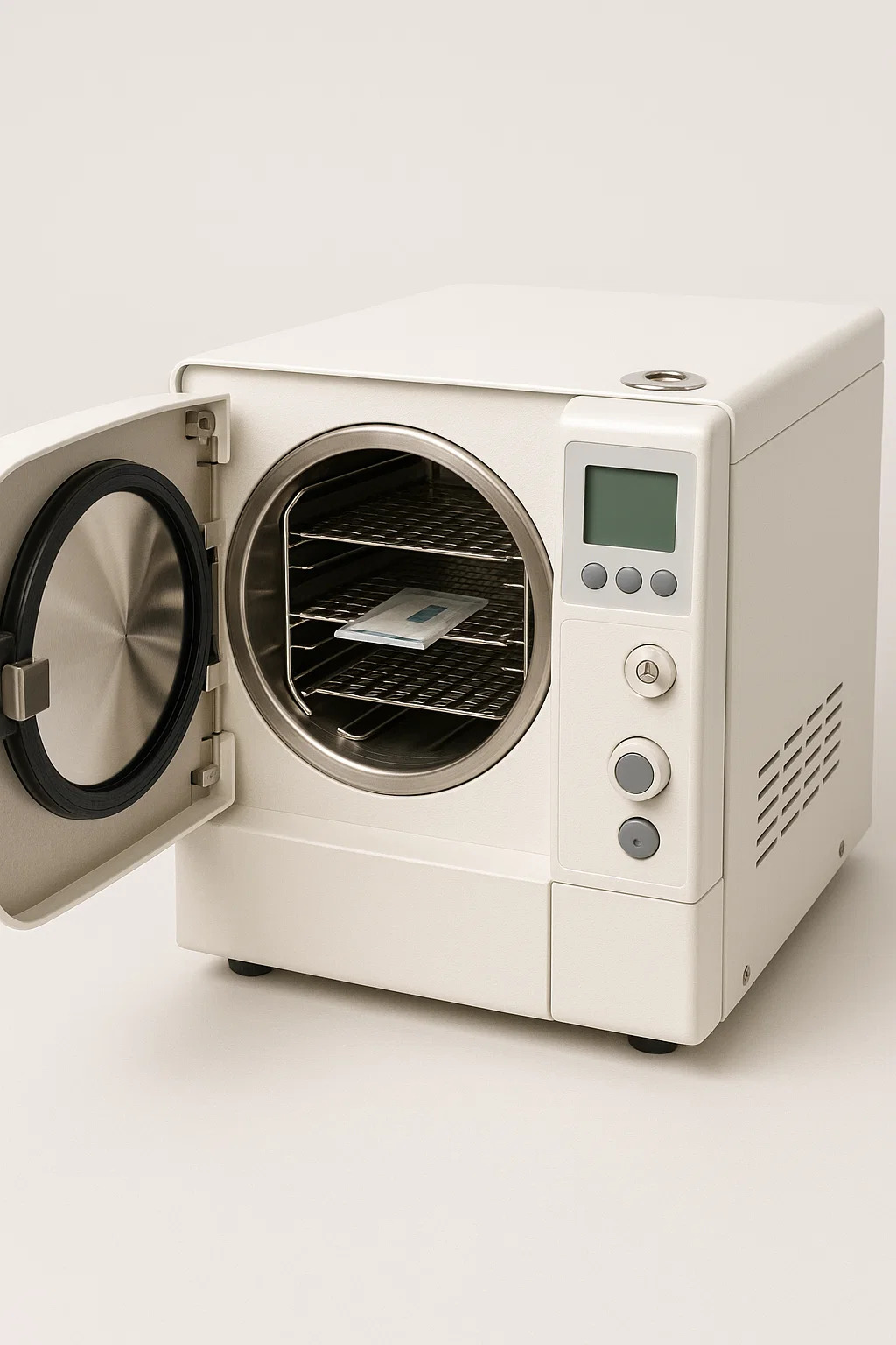 Um dispositivo médico especializado que esteriliza instrumentos odontológicos reutilizáveis usando vapor saturado de alta pressão.