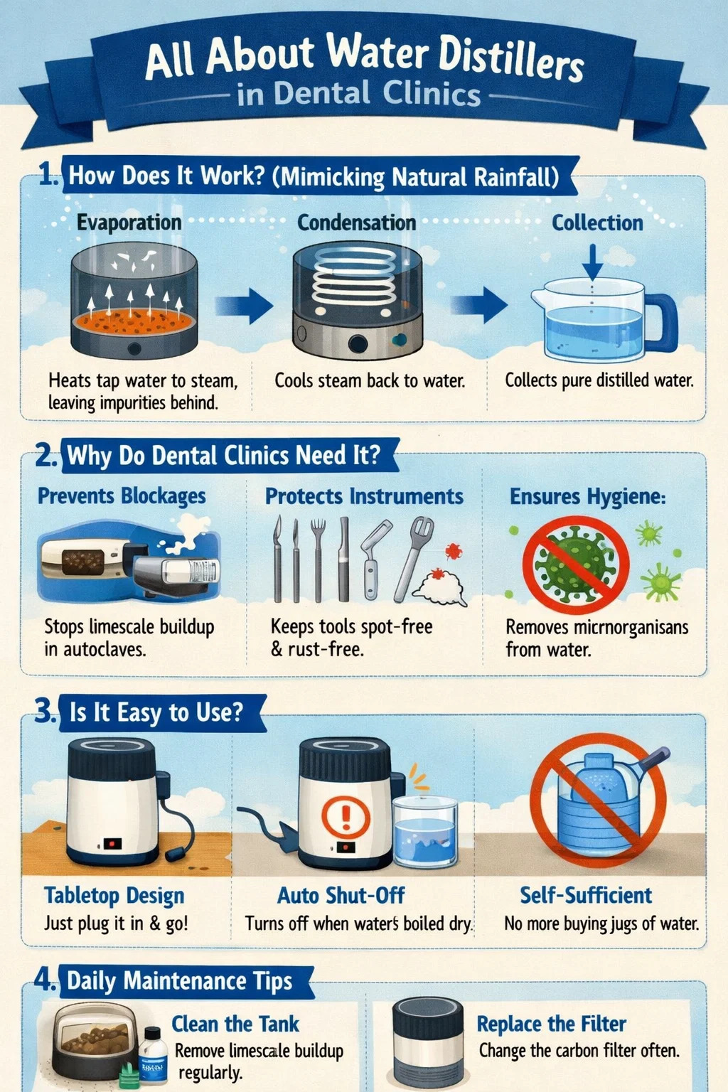 Um destilador de água é essencialmente uma pequena fábrica dedicada à produção de “água pura”. Nas clínicas odontológicas, costuma ser o melhor parceiro para as autoclaves odontológicas, pois as autoclaves são muito “exigentes” quanto à água que utilizam e só podem usar essa água destilada limpa.